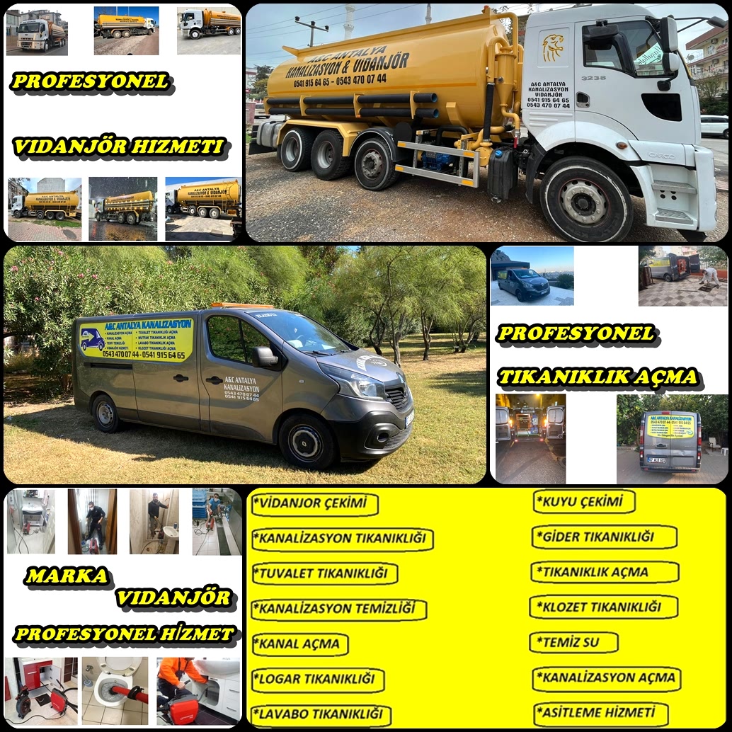 Ekiplerimiz 7 gün 24 saat hizmet vererek Antalya ve Çevresine Kanalizasyon tıkanıklığı , Logar tıkanıklığı , Gider Tıkanıklığı , Lavabo Tıkanıklığı , Vidanjör Hizmeti gibi Birçok Hizmet İmkanına Sahip Olan Marka Vidanjör Sektörde Gururla hizmet etmeye Devam Etmektedir .